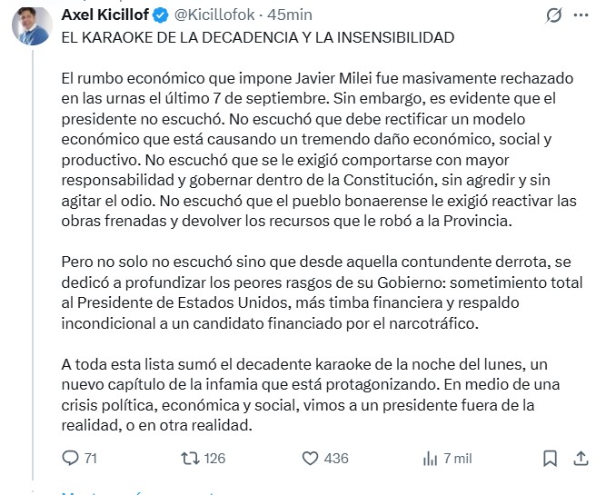 Con un posteo en sus redes titulado El Karaoke de la decadencia y la insensibilidad, el gobernador de la Provincia volvió a cargar contra el presidente.