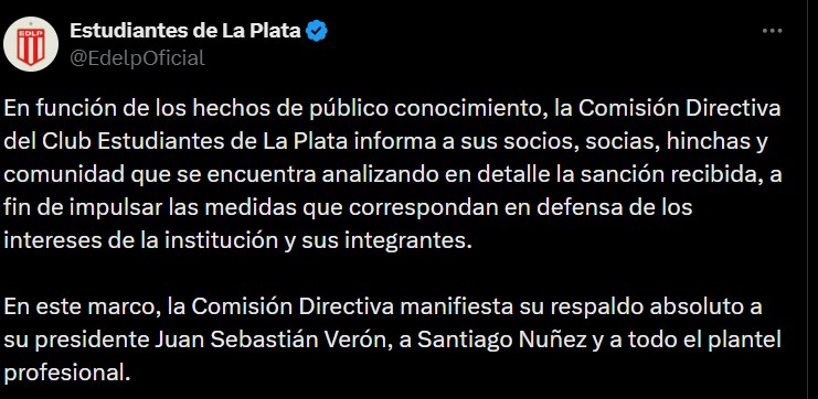 “En función de los hechos de público conocimiento, la Comisión Directiva del Club Estudiantes de La Plata informa a sus socios, socias, hinchas y comunidad que se encuentra analizando en detalle la sanción recibida, a fin de impulsar las medidas que correspondan en defensa de los intereses de la institución y sus integrantes. En este marco, la Comisión Directiva manifiesta su respaldo absoluto a su presidente Juan Sebastián Verón, a Santiago Nuñez y a todo el plantel profesional”, dice el comunicado del Pincha.