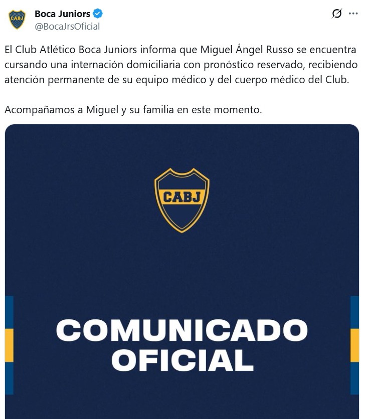 Ante la preocupación pública, el club difundió un comunicado oficial en el que detalló: “El Club Atlético Boca Juniors informa que Miguel Ángel Russo se encuentra cursando una internación domiciliaria con pronóstico reservado, recibiendo atención permanente de su equipo médico y del cuerpo médico del Club. Acompañamos a Miguel y su familia en este momento”, informó la institución.
