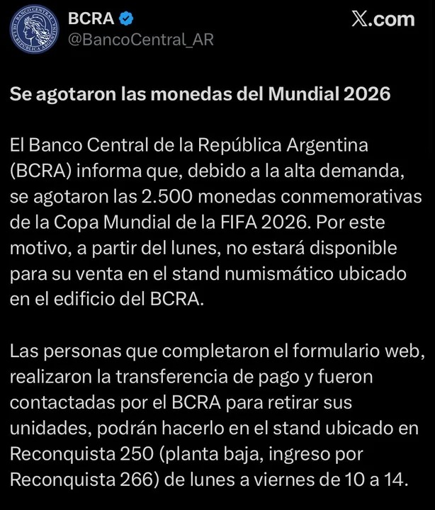 A través de un comunicado publicado en su cuenta oficial de X, la entidad informó que el stand numismático ubicado en su edificio ya no ofrecerá la pieza, aunque quienes realizaron el trámite de compra podrán retirarla en Reconquista 250, de lunes a viernes entre las 10 y las 14.