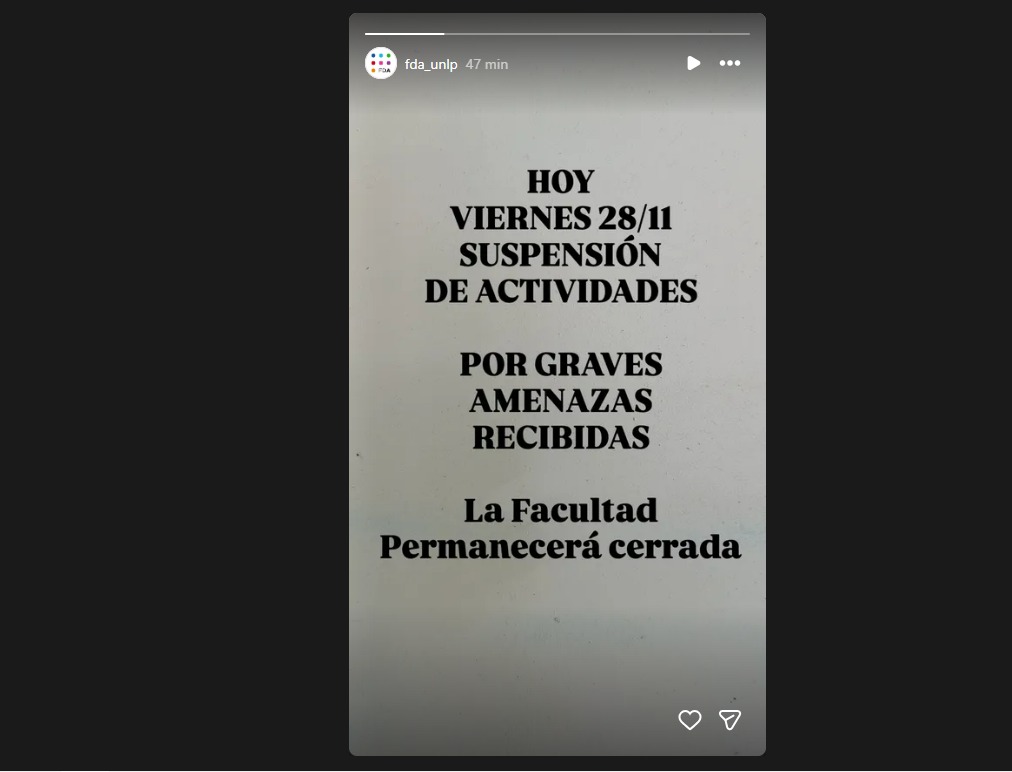 La noticia se confirmó cerca de las 10 de la mañana de este viernes. Desde la institución, cuya sede central está sobre diagonal 78, a metros de Plaza Rocha, dieron a conocer la situación con un escueto comunicado. “Hoy viernes 28/11 suspensión de actividades por graves amenazas recibidas. La Facultad permanecerá cerrada“, indicaron.